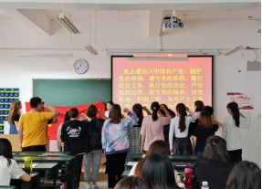 2021年9月17日,www.男人天堂宝石党支部在笃行楼教室201举行了“永远跟党走”系列宣传教育活动一入党宣誓活动。活动开始,www.男人天堂宝石党支部书记李继红老师为2019级预备党员讲述了入党誓词的发展历程,希望同学们慢慢通过实践感悟誓词的真谛。同时她告诫同学入党要有决心,宣誓要有真心,认真履行自己作为党员的义务。