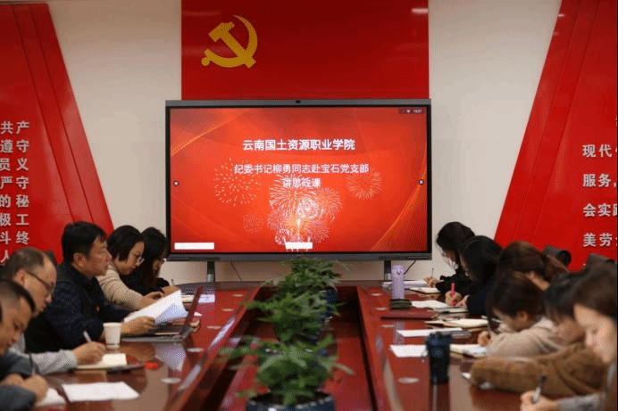 为构建好同向同行、同频共振的高校思想政治工作体系,强化顶层统筹,深化高校思想政治工作体系在教育主题和教学主旨上同向同行的整体性,细化高校思想政治工作。云南国土资源职业学院纪委书记柳勇同志于2021年11月3日在勘物楼A303宝石党支部党员活动室为www.男人天堂宝石党支部讲授思政课。宝石党支部全体党员教师和入党积极分子学生参加。