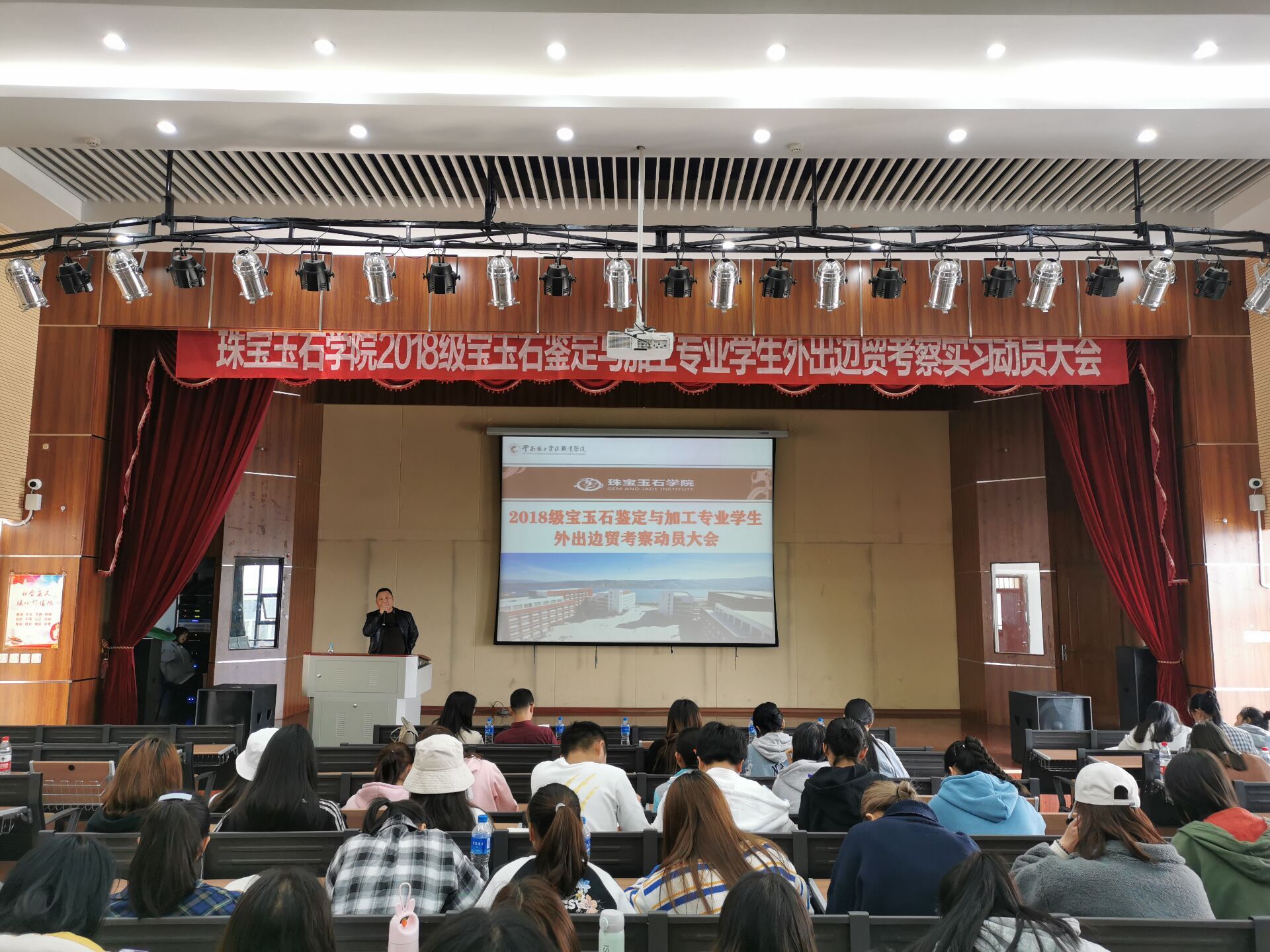 2019年11月26日中午,珠宝玉石学院宝玉石鉴定与加工专业学生外出边贸考察实习动员大会在光荣讲堂如期举行。出席本次实习动员大会的有此次实训考察带队教师代表李根云老师、陈雨帆老师、胡睿老师、汪朝飞副院长以及18级宝玉石鉴定与加工专业的全体同学。此次活动由李根云老师主持。