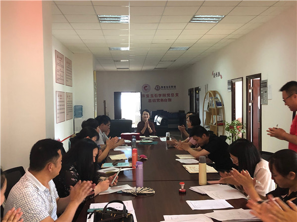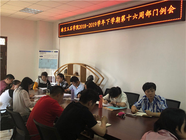 2019年6月14日下午,珠宝玉石学院2018-2019学年下学期第十六周学院部门例会在云南国土资源职业学院阳宗海校区勘物学院办公室召开,珠宝玉石学院党总支书记陈畅、副院长刘德利及学院全体教师参加了此次会议。会上,学院各部门对近期工作进行情况汇报,同时对工作中遇到的问题进行汇总、协调、解决。