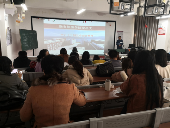 2020年11月6日珠宝旅游党总支在笃行楼222教室组织全体党员教师认真学习了党的十九届五中全会精神。会议上杨飞作为总支书记为大家宣讲了党的十九届五中全会相关精神。