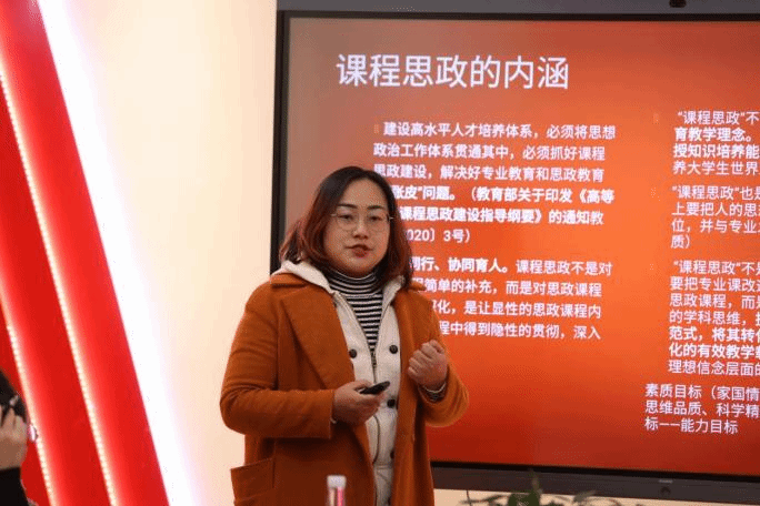 接着高薇老师为老师们讲解了课程思政的内涵,要求各位老师温习马克思主义哲学的基本观点及其运用方法,掌握人类思维工具;学习十九大以来的主要精神,掌握未来五年基本政策依据;结合专业方向,深入学习了解党和国家相关理论和政策,并明确要建设高水平人才培养体系,就必须将思想政治工作体系贯穿其中,解决好专业教育和思政教育“两张皮”问题。做到同向同行、协向育人。