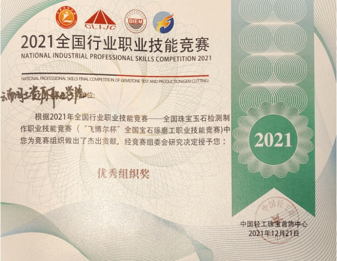 12月21日,2021年全国行业职业技能竞赛“飞博尔杯”宝石琢磨工职业技能竞赛总决赛在北京经济管理职业学院固安校区顺利落下帷幕。比赛由中国轻工业联合会、中国轻工珠宝首饰中心、中国就业培训技术指导中心及中国财贸轻纺烟草工会全国委员会主办,由晋江海峡职业培训中心、北京经济管理职业学院承办,竞赛所用设备由深圳市飞博尔珠宝科技有限公司独家赞助。此次总决赛分为职工组和学生组,分别设有理论测试和实际操作技能两个竞赛环节,要求参赛选手在规定时间内完成两颗宝石的切磨及理论答题。重点考察参赛选手的知识能力和技艺水平。
