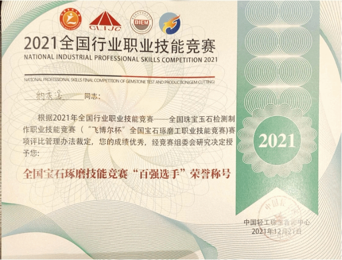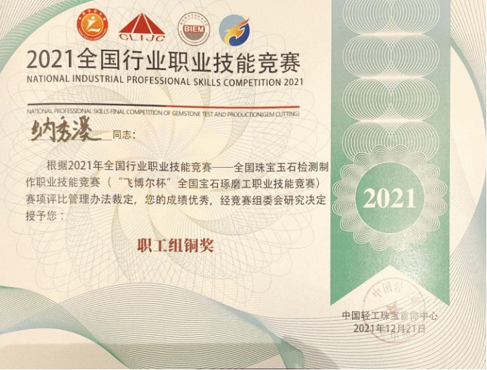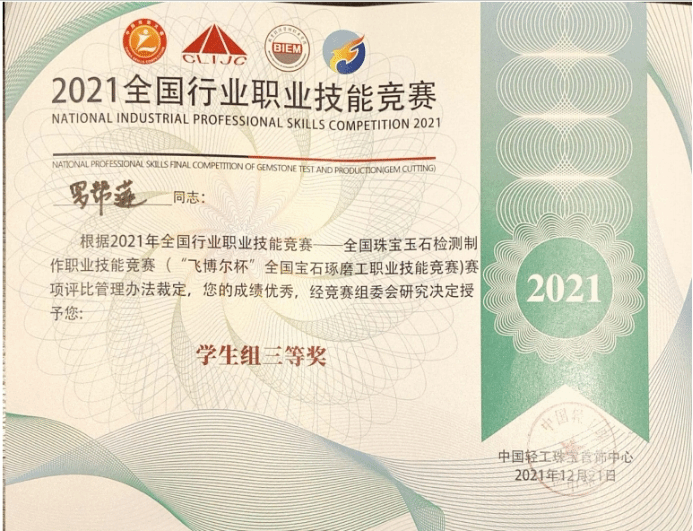 我院的罗帮莲同学获得学生组三等奖和全国宝石琢磨技能竞赛“百强选手”称号,纳秀溪老师获得职工组铜奖与“全国轻工技术能手”称号、全国宝石琢磨技能竞赛“百强选手”称号;云南国土资源职业学院获得“优秀组织奖”。
