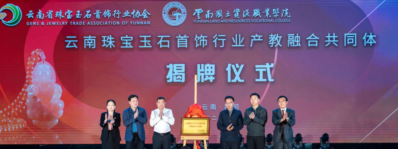 云南省教育厅职业教育与成人教育处处长龚利春、副处长胡正刚、云南省珠宝玉石首饰行业协会会长欧战洪、中国地质大学(武汉)珠宝学院党委书记薛保山、云南国土资源职业学院党委书记牛定柱、校长陈颖为云南珠宝玉石首饰行业产教融合共同体揭牌。