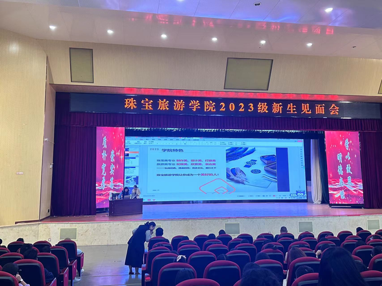 接着珠宝学院副院长杨家娣为新生讲述了学院的各个专业及该专业的就业面向和前景,讲述学院专业技能竞赛以及学院各专业以赛促教、以赛促学的教学理念。为同学们详细介绍各专业及教研室组成,讲解日常的教学安排及要求,介绍学院合作企业及相关专业资格证书,讲解提升自我学历的方法类型及途径,并赠与同学们一首诗希望与同学们一起共勉。对同学们的美好未来做出展望。