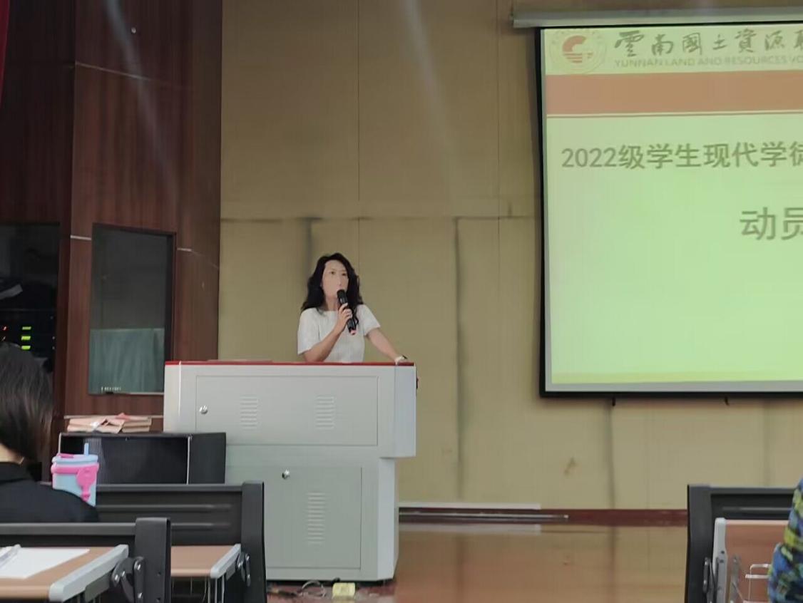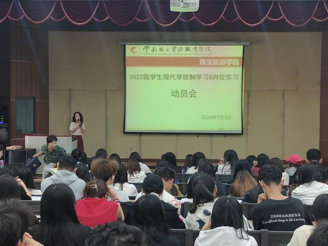 7 月 3 日,www.男人天堂于光荣讲堂召开2022级学徒制学习及岗位实习动员会,宝玉石鉴定与加工专业群杨莉主持,www.男人天堂院长陈畅、副院长杨家娣、党委书记张颖、党委副书记张军红、教务处夏俊伟、招生与就业处原菲菲,2022 级全体辅导员、班主任、学徒制学习、岗位实习指导教师及 2022 级全体学生参与。