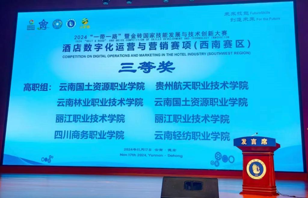 第八届“一带一路”暨金砖国家技能发展与技术创新大赛的酒店数字化运营与营销赛项(西南赛区)区域选拔赛于2024年11月15日—17日在云南省德宏州芒市德宏职业学院进行,我院的参赛队伍表现出色,两支队伍荣获三等奖。这一成绩标志着酒店管理与数字化运营专业在此类高水平国际赛事中的首次重大突破,并且成功获得了进入全国总决赛的资格。