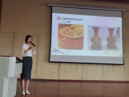 第一位是高级导游、文旅部“金牌导游”、民族博物馆专题讲解员蔡淑玲老师。她讲座的主题是《非遗传承在云南》,蔡老师从三个方面为我们讲解了什么是非物质文化遗产、非物质文化遗产与旅游有什么关系、云南的非物质文化遗产代表作品(鹤庆银器、乌铜走银、斑铜等)。