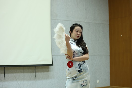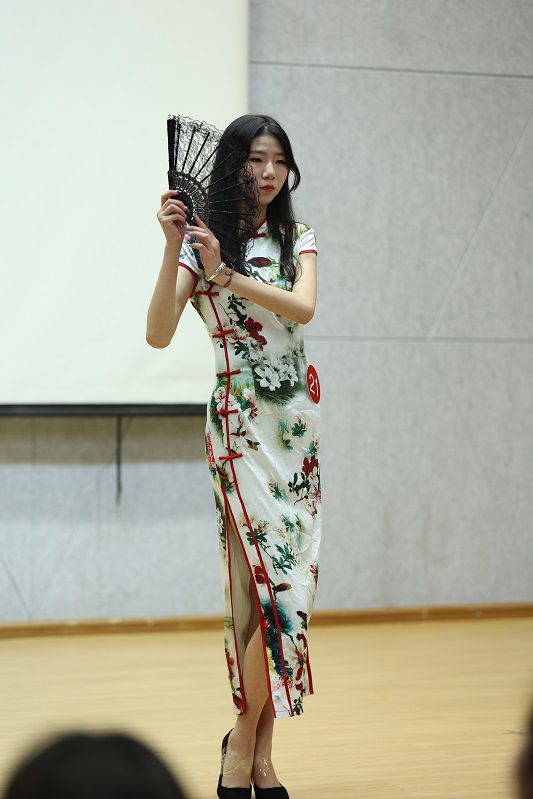 舞台上,一首中国风的音乐响起,模特们一一上台走秀,她们身着旗袍真是所谓中华有佳人,芳龄韶华,眉目如画。着一袭旗袍,香风细细在陌陌红尘里,婀娜多姿,暗香流韵。流水的线条,轻微的挪步,一颦一笑,韵味十足,尽显东方女性之美。第一轮旗袍秀结束,舞台上又响起了一首英文歌,模特们再一次走上舞台,这次她们身着西式礼服,当裙摆随着模特的步伐而摆动时,礼服更加衬托出了选手们优美的身姿与线条。她们踏着高跟鞋,大步且自信的在舞台上展示着自己,充分展现了女性热情张扬的个性,她们是新时代女性,自信、独立且勇敢。当男生身着西服走上舞台,他们步伐沉稳,坚定。他们的一举一动都透露着男士该有的沉着、冷静,尽显绅士之风。